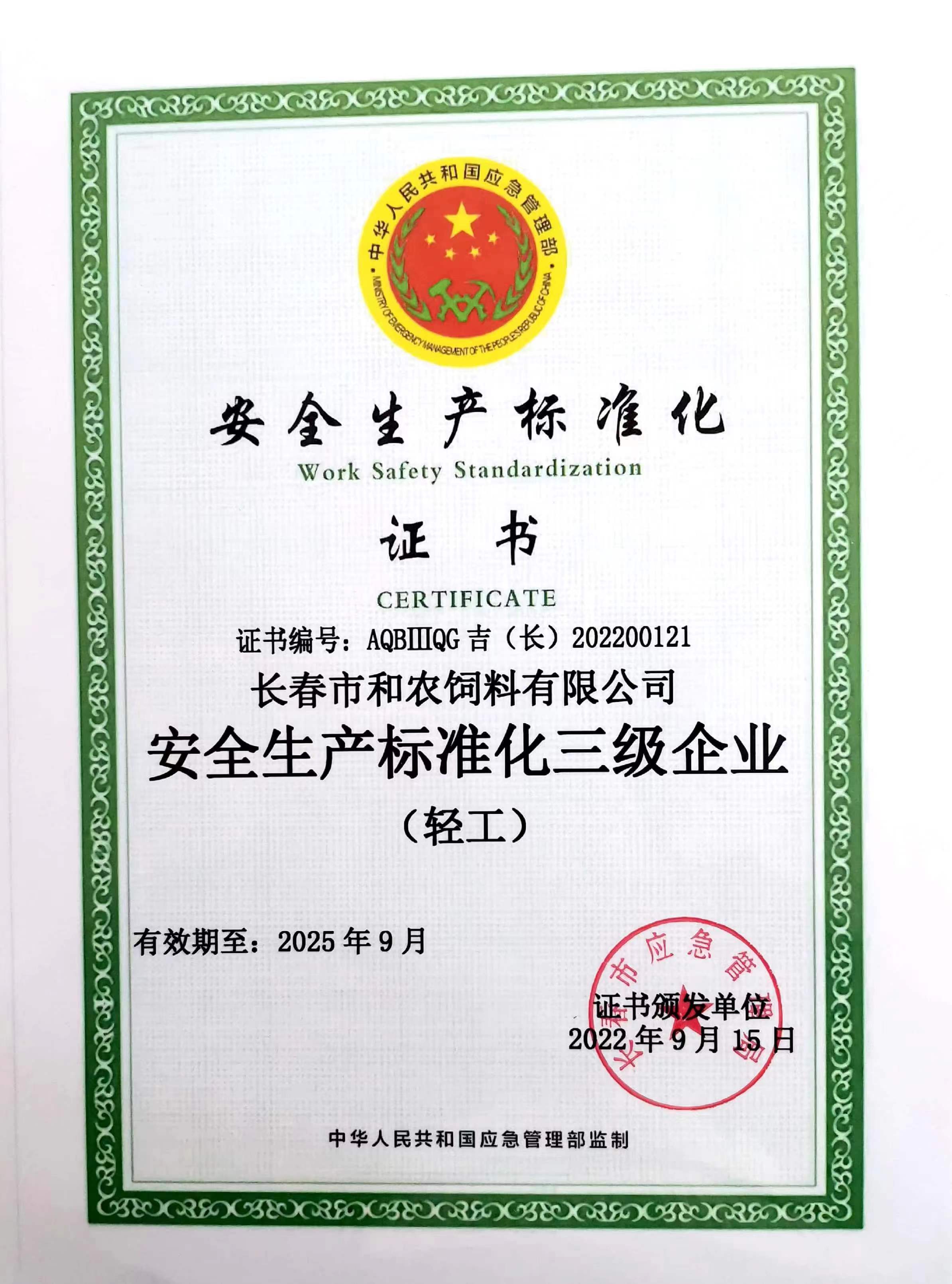 和農(nóng)牧業(yè)集團(tuán)下屬公司 長春市和農(nóng)飼料有限公司榮獲由長春市應(yīng)急管理局頒發(fā)、中華人民共和國應(yīng)急管理部監(jiān)制的“安全生產(chǎn)標(biāo)準(zhǔn)化三級企業(yè)”證書,標(biāo)志著長春和農(nóng)飼料安全生產(chǎn)標(biāo)準(zhǔn)化建設(shè)邁上新臺階。