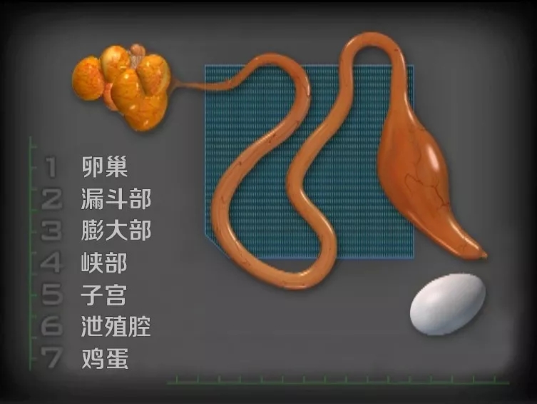 蛋雞的生殖系統(tǒng)稱為輸卵管,包括卵巢、漏斗部、膨大部、峽部、子宮、泄殖腔。大多物種的雌性動(dòng)物具有左右兩條輸卵管,但鳥類只發(fā)育了左邊那條,長約2英尺(60厘米)。